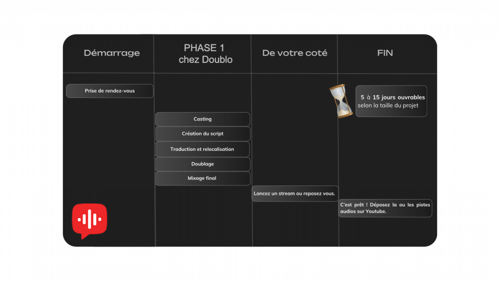 Tous nos doublages sont réalisés entre 5 et 15 jours, sauf cas spécifiques (Vidéos de plus de 45 minutes…)